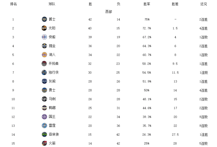 JRS直播网讯 今天进行的常规赛都非常精彩,其中有多达11支西部球队出战,西部的竞争是非常激烈的,在常规赛所剩场次不多的情况下各队都在为着自己的目标而努力。今天有爵士连胜稳居榜首、独行侠输给尼克斯、快船输掉强强对话、掘金连胜、森林狼爆大冷、火箭输球跌至倒数第一,接下来我们一起来看看西部最新排名: