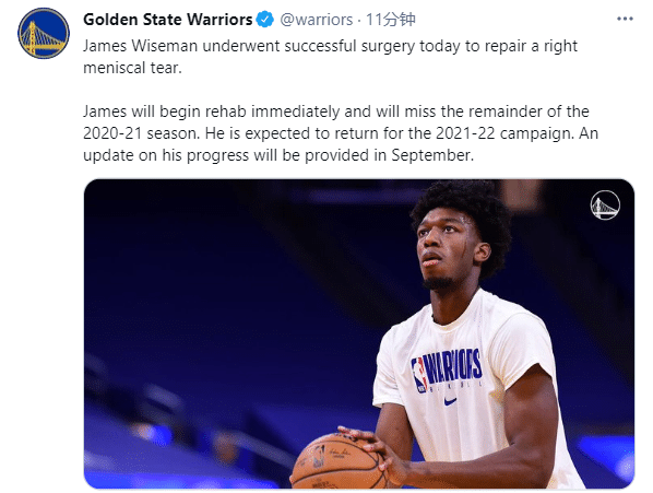 JRS直播网讯勇士正式官宣20岁榜眼赛季报销,勇士官方发推写道:詹姆斯-怀斯曼成功接受半月板修复手术,赛季报销;怀斯曼立即进行康复,预计将在2021-22赛季季前训练营回归,勇士将在9月份更新他的伤情;怀斯曼在洛杉矶做手术,因半月板撕裂而赛季报销。