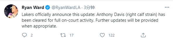 JRS直播网讯湖人巨头终于要复仇了,湖人对阵凯尔特人赛前,沃格尔透露安东尼-戴维斯已经获得参加球场完整训练的许可,这意味着浓眉小腿伤势已经痊愈,虽然接下来几场比赛,浓眉不太可能出战,但这是浓眉复出的重大利好;湖人也已官宣这个喜讯。