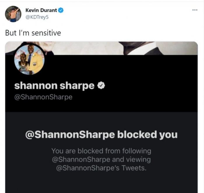 这件事情在社交媒体中引起了广泛讨论,很多网友都在猜测到底这件事情谁对谁错,又或者是杜兰特到底有没有说过这种不尊重詹姆斯的话。然而随后这个名叫夏普的名嘴就在社交媒体中回应了杜兰特,他说如果杜兰特想找他交流一下并不难,不过他不会在社交媒体中和杜兰特对喷,私下里可以解决这件事情。发表完这个声明之后,这位名嘴居然就直接将杜兰特给拉黑了。