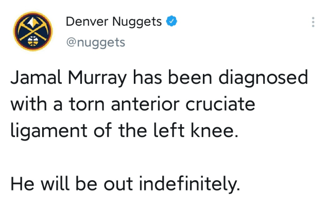 JRS直播网讯北京时间4月14日,掘金官方宣布,后卫贾马尔-穆雷遭遇左膝前十字韧带撕裂的伤病,将无限期休战。名记查拉尼亚报道称,这一伤病将导致穆雷赛季报销。穆雷在对阵勇士比赛的最后时刻意外受伤,如今检查结果显示伤情严重。缺少了他这块重要的拼图,掘金本赛季的冲冠前景无疑是一片黯淡。