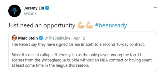 JRS直播网讯北京时间4月14日,林书豪转发名记马克-斯坦恩的一则动态,表达了自己对重返NBA打球的渴望。斯坦恩写道:“步行者与奥谢-布里塞特签下第二份10天合同,林书豪成为了G联赛得分榜前11位里唯一一个没和NBA签约的球员。”林书豪转发配文写道:“只是需要一个机会#已经准备好了。”