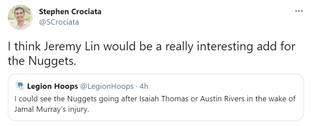 美媒报道称,掘金或许会考虑小托马斯和小里弗斯,也有球迷建议掘金考虑林书豪。毕竟,顶替穆雷的坎帕佐的身高只有1米78了,他们不适合再找一个矮个子后卫,相比之下,身高1米90的林书豪或许更适合掘金的需求。