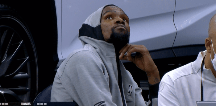 下半场,杜兰特第三节再次开启得分模式,强突奥科吉打成不讲理2+1,外线三分飙起来,不可阻挡的死神单节独砍14分,带领篮网领先30分结束前三节;期间杜兰特再次咧嘴大笑,输赢早已没有悬念。