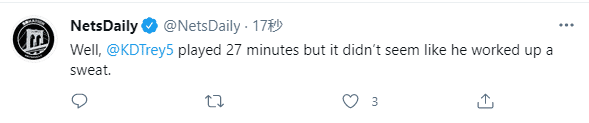 末节杜兰特又打了将近4分钟,篮网121-78足足领先43分,杜兰特终于打卡下班,还没怎么出汗便造惨案,拿下一场30分大胜;这是杜兰特伤愈复出的第三场比赛,进攻状态太无解;赢球后篮网37胜17负战绩又追平费城,仅以微弱的劣势暂居东部第二。