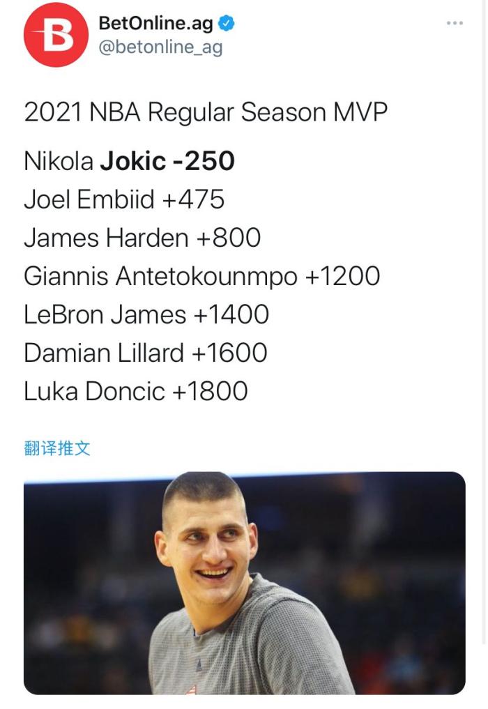 JRS直播网讯随着NBA本赛季常规赛的赛程逐步深入,常规赛MVP这一重大奖项的争夺也进入到了白热化阶段,NBA官方还有诸多媒体给出的MVP榜单显示出本赛季的MVP有着很大的不确定因素,因为没有球员现在就可以锁定MVP的位置。而还有不少美国媒体另辟蹊径,他们虽然没有明面上给出MVP的排行榜,但是却给出了有希望拿到本赛季MVP的球员赔率,下面就让我们来看一看这份赔率榜单。