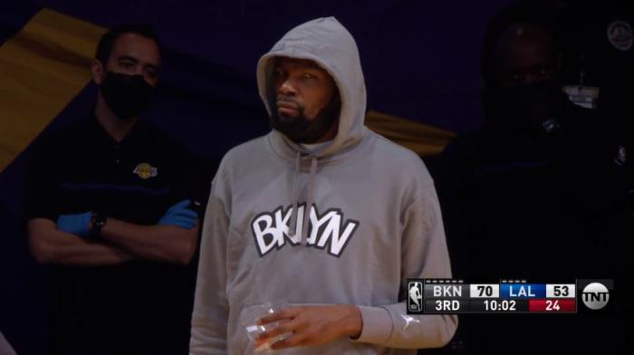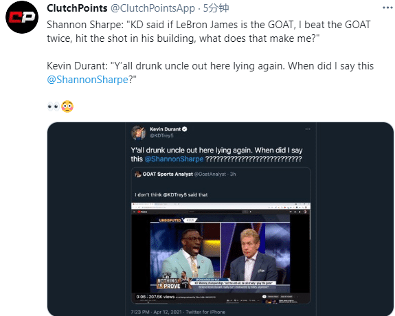球迷转发名嘴Shannon Sharpe言论,Shannon Sharpe在揭幕战说:杜兰特说如果詹姆斯是历史最佳(GOAT),我就两次击败历史最佳,在他的主场颜射他(詹姆斯),那我该怎么想呢?