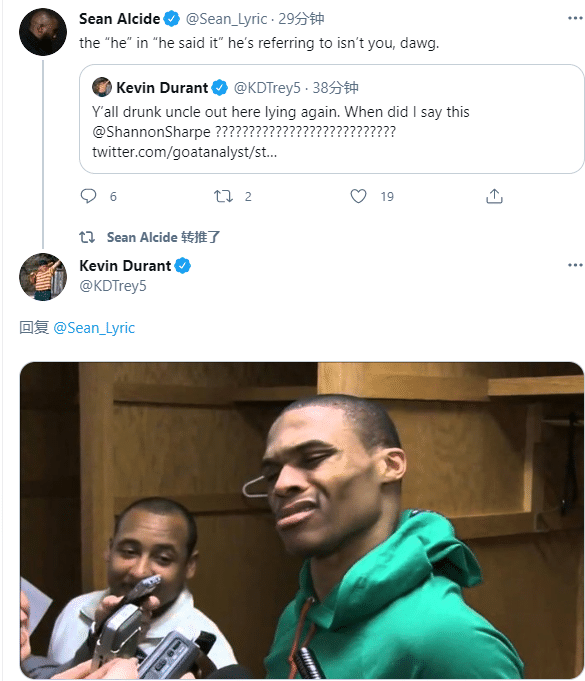 sean Alcide发推解释香农-夏普所说的他并不是指杜兰特,对此杜兰特晒韦少蛮横表情,再次强势回应别人。