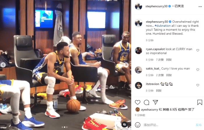 库里在社交媒体上晒更衣室画面以及合影,并且写道:现在还有点不知所措,我只能说谢谢你们,需要花点时间来享受这个,谦逊和祝福。