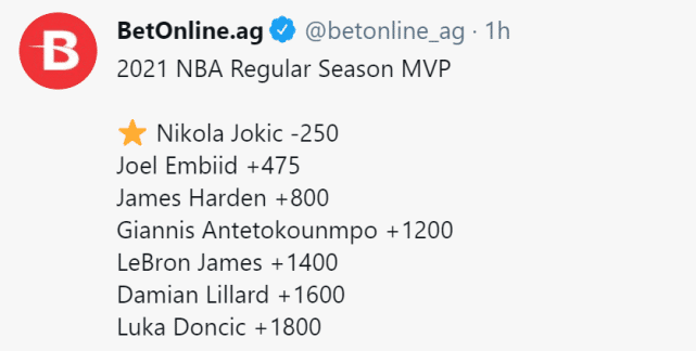 JRS直播网4月13日讯 北京时间4月13日,2021年常规赛MVP的最新赔率出炉,约基奇(-250)继续领跑,而且扩大了领先优势。恩比德(+475)排名第二,哈登(+800)位居第三。排名第4-7位的依次是字母哥(+1200)、詹姆斯(+1400)、利拉德(+1600)和东契奇(+1800)。