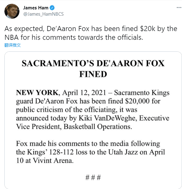 国王新星福克斯因公开批评裁判被罚款2万美元,此前对阵国王赛后,福克斯炮轰裁判:裁判太糟糕了,他们看起来高高在上,一副不想理你的样子。