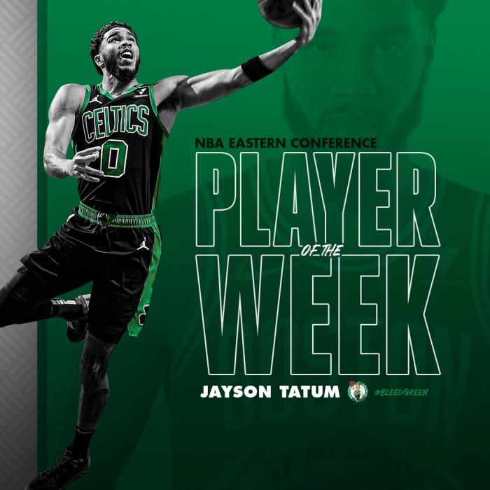 上周,塔图姆场均狂砍31.5分8.5篮板3.8助攻,带领凯尔特人取得了3胜1负的战绩;尤其是对阵森林狼,塔图姆打出生涯代表作——出战41分钟轰下53分10篮板4助攻,得分创生涯新高并且成为队史最年轻50分先生;本赛季塔图姆第二次夺得周最佳,生涯第三次。