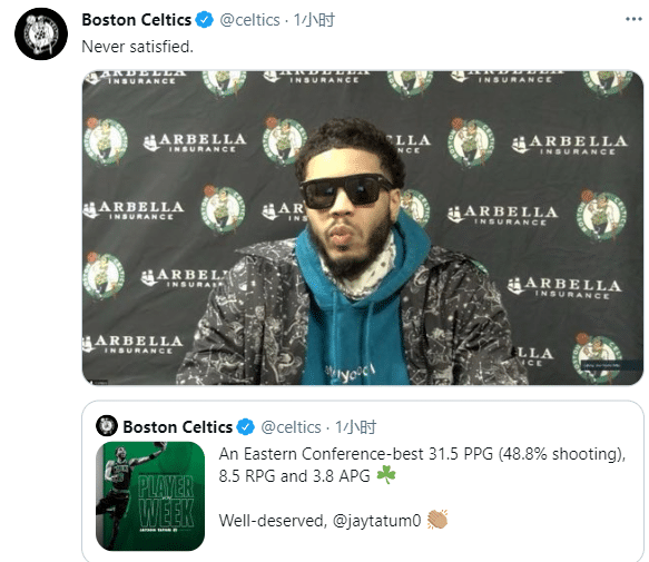 23岁塔图姆上周连续三场25+10创纪录,03年皮尔斯之后,队史最长连续纪录;凯尔特人官方恭喜塔图姆,发推写道实至名归;还晒出塔图姆戴墨镜采访照,并且写道:从不满足。