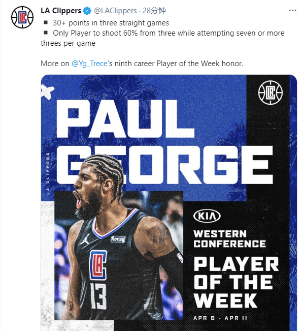 乔治本赛季首次当先西部周最佳球员,职业生涯第19次周最佳;乔治上一次夺得周最佳是在19年2月份,时隔两年多再次夺得周最佳大奖;快船官方连续更新动态,发推恭喜乔治夺得西部周最佳,是上周唯一一位场均至少出手7次三分且命中率60%+的球员。