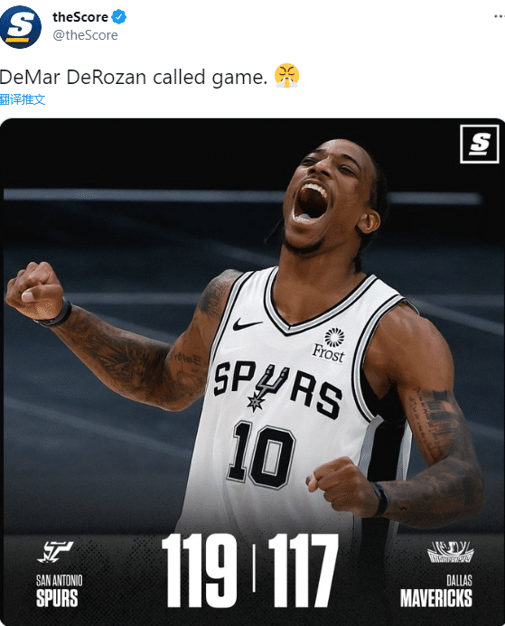 JRS直播网讯马刺119-117险胜独行侠,德罗赞全场上场34分钟25投13中轰下33分8助攻5篮板,终场前0.5秒极限中投绝杀,德罗赞绝杀独行侠冲上热搜引热议,马刺官方连续更新动态,发推写乱码疯狂庆祝,马刺名宿吉诺比利也口出乱码,为德罗赞绝杀而疯狂庆祝。