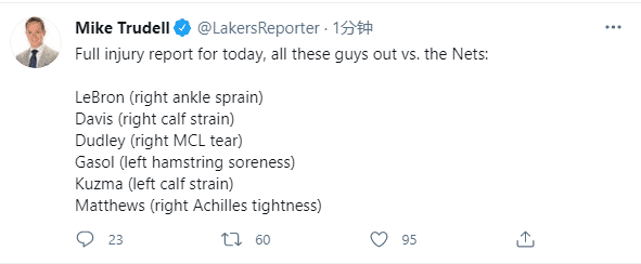 JRS直播网讯湖人对阵篮网之前,湖人队伤病大名单再次更新,全队多达6名球员因伤无法出战,据湖人随队记者Mike Trudell报道,詹姆斯(脚踝扭伤)、浓眉(小腿拉伤)、库兹马(小腿拉伤)、小加索尔(左腿筋酸痛)、马修斯(右跟腱紧张)和杜德利(韧带伤病)全都伤停,卫冕冠军太惨了。