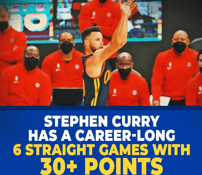 库里连续6场比赛砍下30+,追平奇才球员布拉德利-比尔,并列赛季最长;