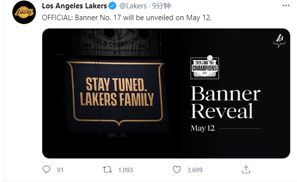 JRS直播网4月9日讯 湖人美女老板珍妮-巴斯透露,湖人将在5月13日对阵火箭时悬挂上赛季的总冠军旗帜;随后湖人官宣这一消息,湖人升起总冠军旗帜的时间终于确定下来了;湖人官推晒图并且写道:第17面冠军旗帜将在5月13日升起。