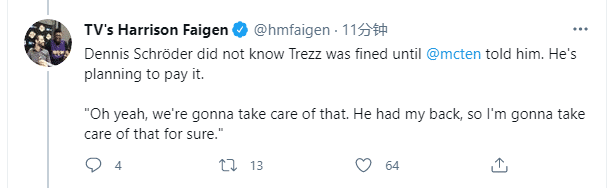 施罗德还谈到哈雷尔被联盟罚款两万美元;施罗德表示愿意替施罗德交罚款,我们一定会处理好的,他本来就是为我出头,我会替他妥善处理这笔罚款。