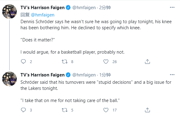 为何施罗德进攻状态这么糟糕?赛后施罗德表示他受到膝伤的困扰,本来不确定能否出战,拒绝透露具体受伤的情况;谈到失误时,施罗德表示他的失误都是愚蠢的决定,成为湖人的一个大问题,直言:责任在我,我没有保护好球,我的传球太随意,我要做得更好。