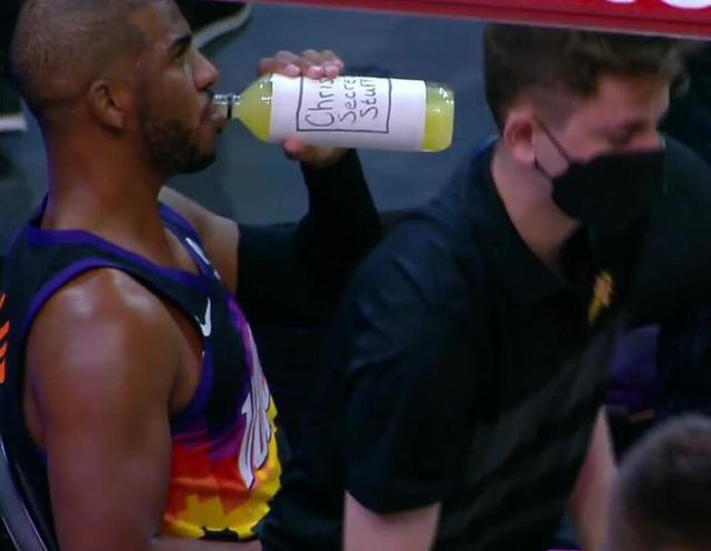 我们再来说说保罗喝的黄色液体是什么?很多球迷认为是黄色的佳得乐,答案显然不是,佳得乐是NBA的饮料赞助商,如果喝的是佳得乐,保罗完全不需要进行任何的遮挡。而且很重要的一点是,到了保罗这个年龄基本上很少会喝运动型饮料,比如说詹姆斯在比赛中自带的保温杯,再比如我们的CBA“三旬老汉”易建联在比赛中经常会喝吸收更加快的椰子水,而保罗这边的补水饮料,其实是球队的营养师针对球员自身的身体情况调制出来的营养水,它能针对球员的个人需要做到最及时、最好的能量补充。