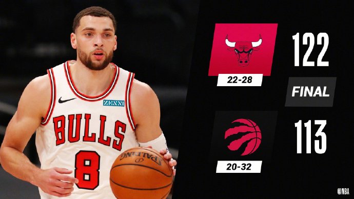 JRS直播网讯:北京时间4月9日,2020-21赛季NBA常规赛继续进行,多伦多猛龙队在主场迎战芝加哥公牛队。最终,公牛队以122-113战胜猛龙队。