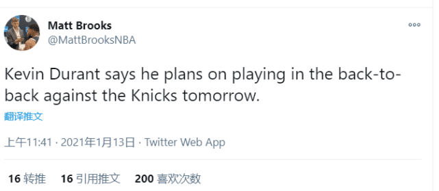 JRS直播网1月13日讯 NBA常规赛,篮网122-116逆转击败掘金。此役,篮网超级巨星杜兰特大爆发,全场比赛18中12极为高效,轰下34分13助9板。篮网在一度落后18分的情况下,几乎凭借杜兰特的一己之力,最终逆转赢下比赛。而在赛后,杜兰特更是表示,自己计划出战背靠背比赛。不知道在参加律师会议的欧文,听到杜兰特这么说,内心作何感想?