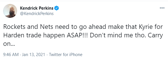 NBA名宿帕金斯在社媒表示:火箭和篮网需要马上进行交易,欧文和哈登互换交易,众所周知欧文因为个人原因已经离队许久了,欧文近两年来一直存在很多莫名其妙的操作,这对于志在争冠的篮网来说无疑是一大隐患。双方的交易是否能够达成,让我们拭目以待吧!