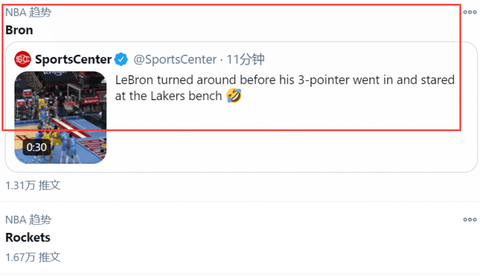 进入第二节,霍顿塔克上演飞天补扣,詹姆斯回到场上后依然不可阻挡,在底角投出三分后,篮球还在空中飞行的过程中,勒布朗就转身面向湖人替补席提前庆祝!众美媒也是纷纷发推转发这一时刻,詹姆斯的名字瞬间冲上了NBA话题下热搜第一的位置!