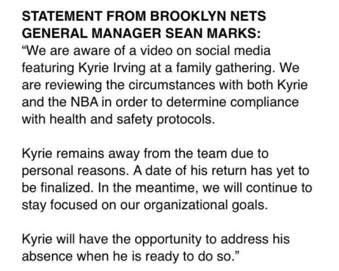 针对联盟调查欧文的事件,不久前篮网总经理正式发表声明,他公开表示:我们知道社交媒体上有一段视频,内容是欧文出现在一次家庭聚会上。我们正在配合NBA一起调查欧文的情况,以确定欧文是否违反防疫规定,欧文由于个人原因离开球队,他的归队日期尚未确定;与此同时我们将继续专注于我们球队的目标。