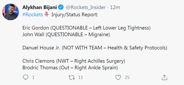 JRS直播网讯 北京时间1月12日,火箭队进行训练,备战和湖人的第二场比赛。对于火箭来说,他们的首发可能会有所变化。据主帅赛拉斯在采访中透露,沃尔由于偏头痛缺席了今天的训练,明天的比赛是出战成疑(questionable,50%上场概率)的状态,而此前由于背部痉挛连续缺席4场比赛的豪斯,出现了新状况,他将因健康安全协议接受隔离,预计缺席更多的比赛。