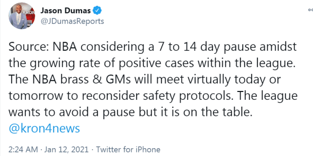 独行侠之前只有克莱伯一人检测呈阳性,但很快这一人数增至四人。独行侠已经关闭训练馆,他们未来的更多比赛预计被延期。热火将在13日客场对阵费城,他们因健康安全协议确定缺战的球员多达8人,包括巴特勒、德拉季奇、阿德巴约、布拉德利、纳恩、哈克莱斯、哈斯勒姆和KZ-奥克帕拉,这些球员预计将接受隔离。