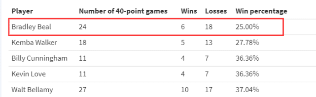 JRS直播网1月11日讯 轰下40+的分数,球队却赢不了球,这显然是一件令人扎心的事。本赛季至今,奇才球星比尔两次得分突破40分,球队却都输了比赛,把上赛季也算上的话,近两年,比尔有12场比赛得分40+,奇才竟然输了其中11场。近日,美媒HoopsHype公布了一份历史球星40+得分的胜率排行榜,比尔排名倒数第一。