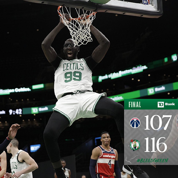 末节,史密斯两罚全中,贝尔坦斯三分命中,史密斯反击再中后,凭借该节开局一波7-2,奇才追至88-98。八村垒扣篮得手,之后三分投中,终场前7分34秒,奇才将比分改写为95-99,从最多落后28分追至只差4分。威斯布鲁克复仇,大帽法尔。普理查德三分命中,斯玛特两罚全中,法尔一抢四,扣篮得手,靠着一波7-0,凯尔特人以106-95领先。贝尔坦斯连续命中三分,奇才101-106落后。布朗追身三分命中,终场前2分08秒,凯尔特人109-101领先。最终,凯尔特人以116-107击败奇才,取得四连胜。