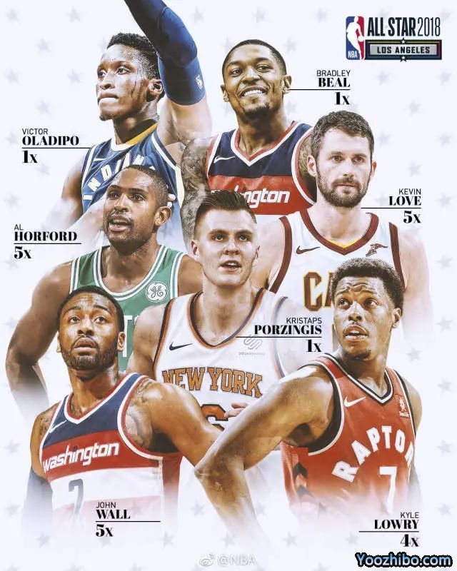 替补:布拉德利·比尔(奇才队)、阿尔德里奇(马刺队)、凯文乐福(骑士队)、拉塞尔·威斯布鲁克(雷霆队)、维克多·奥拉迪波(步行者队)、克里斯塔普斯·波尔津吉斯(尼克斯队)和约翰·沃尔(奇才队)
