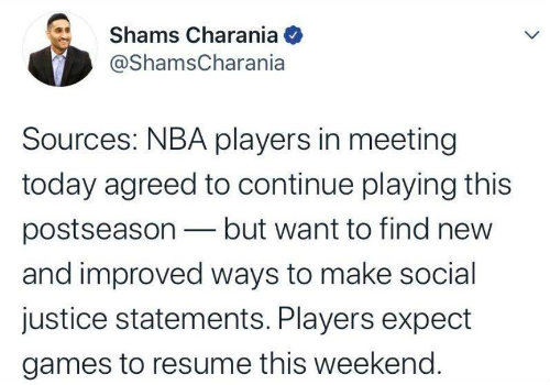Shams补充说球员们也希望能有新的方式来对社会事宜发声,球员们的目标是北京时间8月29日重启季后赛。
