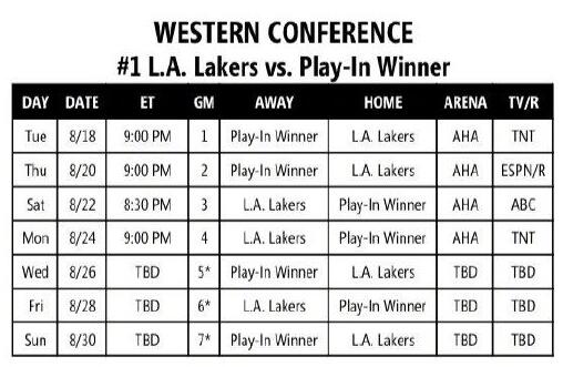 湖人季后赛首轮赛程出炉:8月19号上午9点开战!