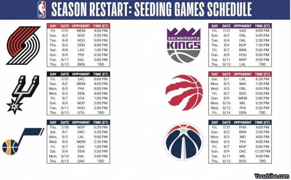 8月1日 魔术-篮网,灰熊-开拓者,太阳-奇才,凯尔特人-雄鹿,国王-马刺,火箭-独行侠;