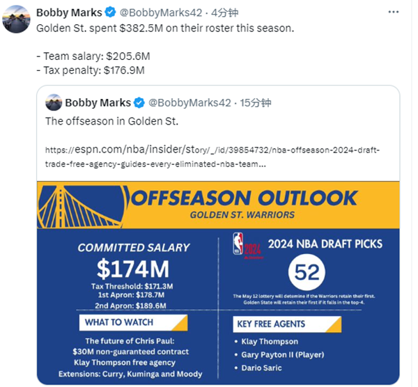NBA薪资专家Bobby Marks报道,金州勇士本赛季在阵容上的总花费为3.825亿美元,球队薪水2.056亿美元,奢侈税:1.769亿美元。