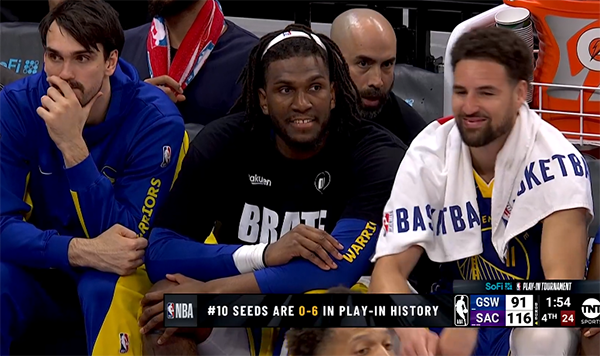库汤追相隔而坐并且沉思很久一幕也曝光,据统计,这是勇士队首次在库里、汤普森和追梦都健康的情况下首次无缘季后赛。