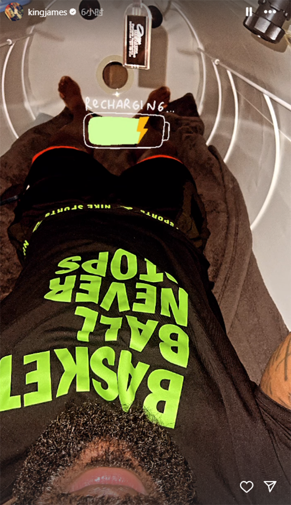 今日詹姆斯晒出自己躺在高压氧舱中理疗恢复身体:重新充满电。