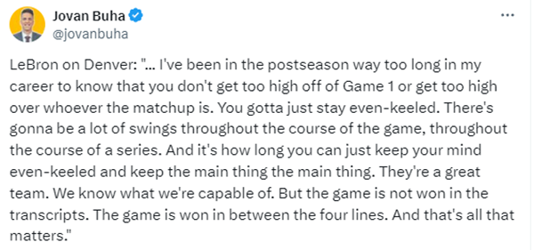老詹还表示:掘金是一支很棒的球队,我们知道他们的能力。比赛胜负靠的不是纸上谈兵,而且取决于在赛场上的表现,这才是最重要的;我们需要做得更好,很明显,我们要面对的是一支伟大的球队,一支赢得了冠军的球队,所以我们只需要非常专注,在48分钟的比赛中,无论需要多长时间,我们都要全力以赴。
