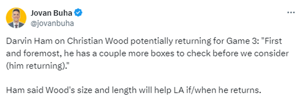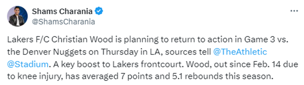 JRS直播网讯 北京时间4月22日,据名记shams报道,湖人内线克里斯蒂安-伍德计划在与掘金系列赛的G3复出,他的回归是对湖人前场的一大关键补充。