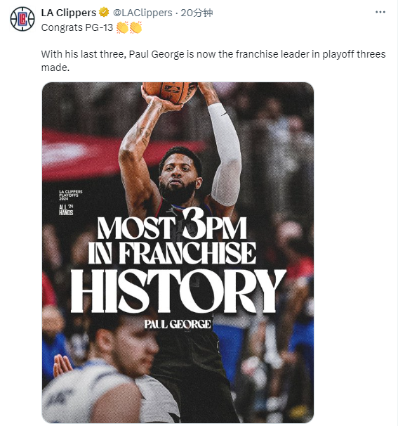 3、乔治成为快船队史命中三分球最多的球员,季后赛队史三分第一人