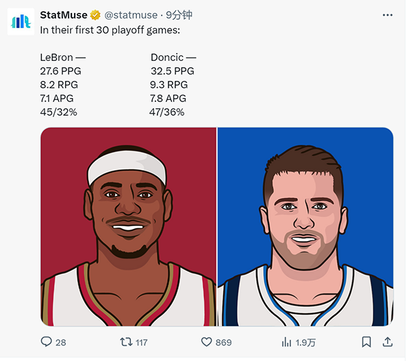 2、东契奇在生涯前30场季后赛中场均32.5分9.3篮板7.8助攻,投篮命中率47%,三分命中率36%;而詹姆斯生涯前30场季后赛的数据为场均27.6分8.2篮板7.1助攻,投篮命中率45%,三分命中率32%。