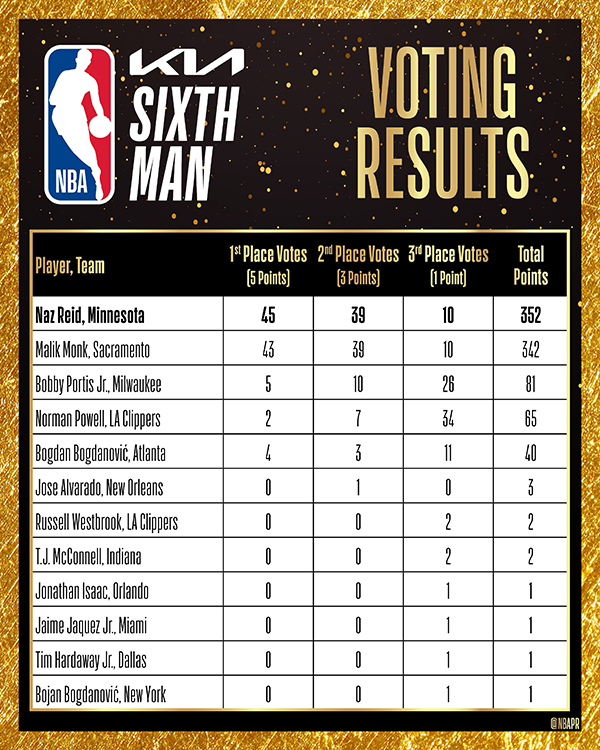 根据最终的投票结果,纳兹-里德(352分)力压蒙克(342分)夺得年度最佳第六人大奖,里德荣获职业生涯第一个年度大奖,里德也成为森林狼队史第一位获此殊荣的球员,NBA历史第3位获第六人的落选秀球员。