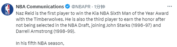 JRS直播网讯 北京时间4月25日,NBA官方又公布一项年度大奖,森林狼中锋纳兹-里德力压蒙克和波蒂斯,当选2023-24赛季的年度最佳第六人。