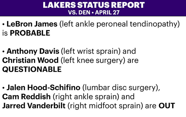 湖人G4伤情报告——詹姆斯(左脚踝腓侧肌腱炎)大概率出战,75%可能性出战;浓眉(左手腕扭伤)、克里斯蒂安-伍德(左膝手术)出战成疑,50%可能性出战;雷迪什(右脚踝扭伤)、希菲诺(腰椎间盘手术)和范德比尔特(右中足扭伤)都因伤继续缺席比赛。