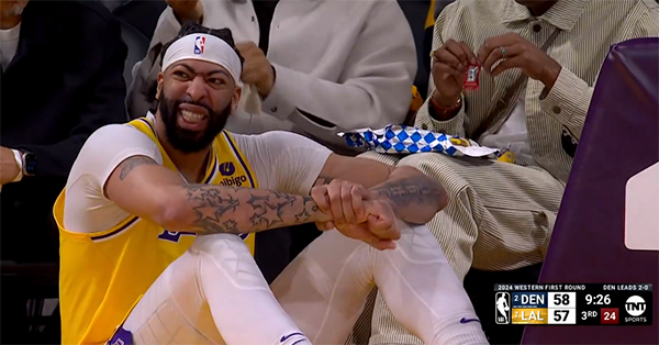 浓眉的手腕伤势是在G3第三节9分26秒受伤的,浓眉强硬突破上篮被约基奇推倒,倒地时扭伤手腕,当时马龙申请挑战,掘金不仅挑战失败,而且追加约基奇防守干扰球,浓眉2分算进但因手腕伤势错失罚球。