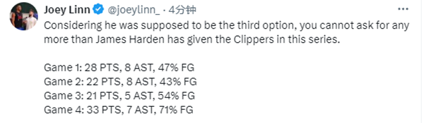 快船队记JoeyLinn则表示:考虑到哈登本来是这支球队的三当家,你真的没法要求他在这轮系列赛中做到更多了。